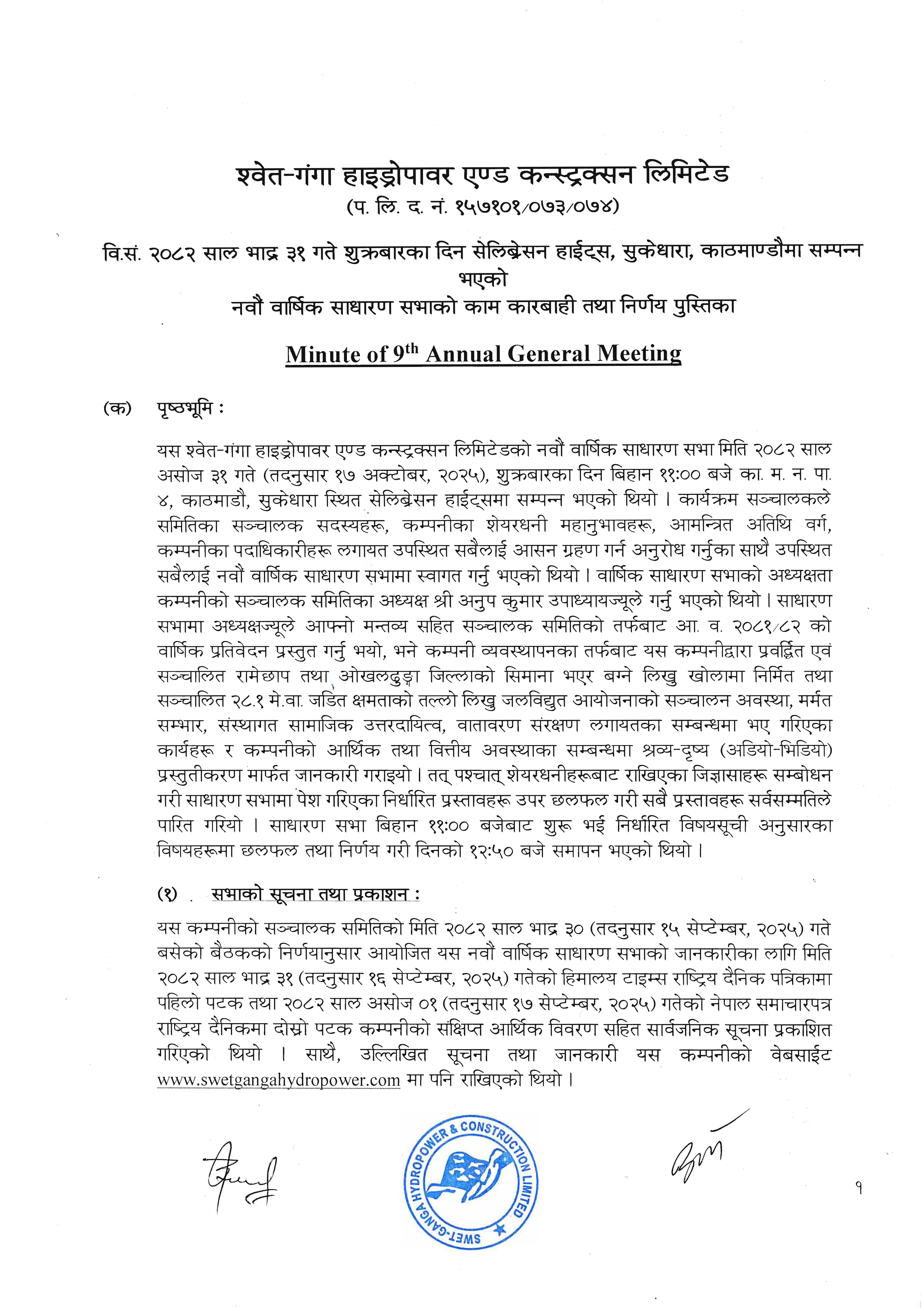Swet Ganga Hydropower & Construction Ltd. (SGHCL) was registered in Department of Industry on 17 Falgun 2061 (28 February 2005) in Kathmandu Nepal as per the prevailing Company Act of Nepal Government. SGHCL is a sister organization of Sanima Hydro Group. It is special purpose vehicle (SPV) to develop and implement Tallo Likhu Jalvidhyut Aayojana with installed capacity of 28.1 MW. The project is a Run-of-River (RoR) type project lying at Ramechhap, Bagmati Provience and Okhaldhunga District, Providence 1, Nepal. .