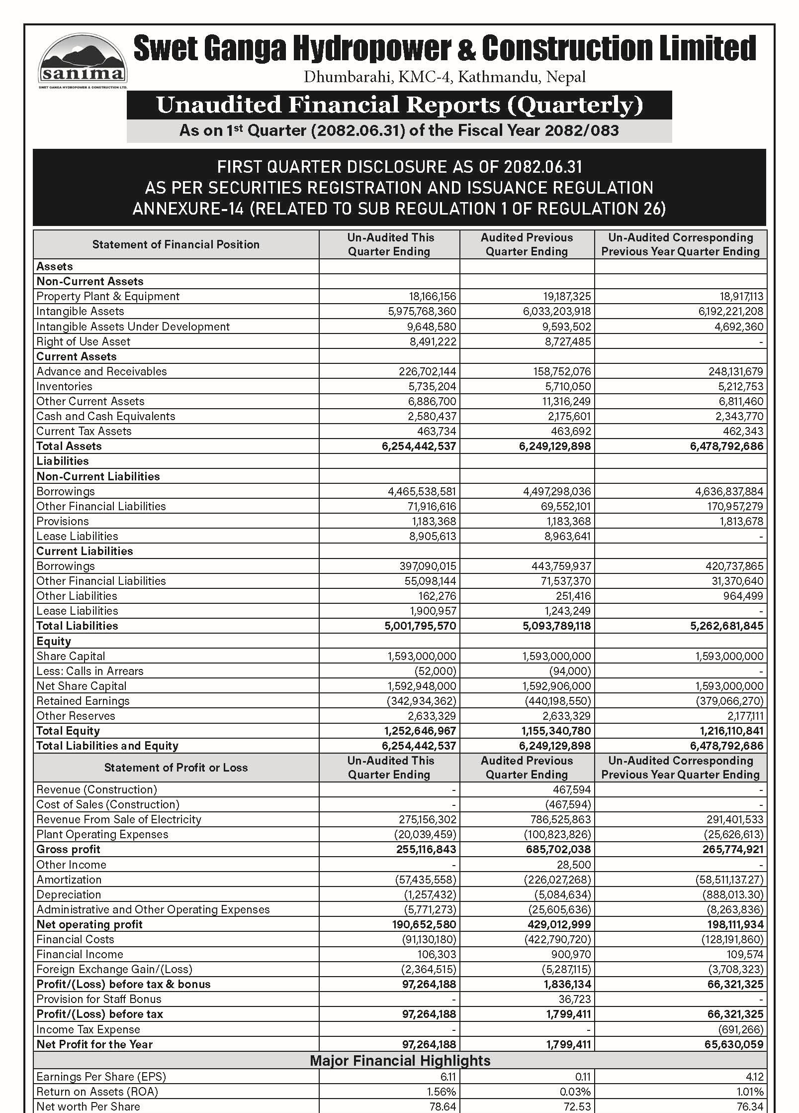 Swet Ganga Hydropower & Construction Ltd. (SGHCL) was registered in Department of Industry on 17 Falgun 2061 (28 February 2005) in Kathmandu Nepal as per the prevailing Company Act of Nepal Government. SGHCL is a sister organization of Sanima Hydro Group. It is special purpose vehicle (SPV) to develop and implement Tallo Likhu Jalvidhyut Aayojana with installed capacity of 28.1 MW. The project is a Run-of-River (RoR) type project lying at Ramechhap, Bagmati Provience and Okhaldhunga District, Providence 1, Nepal. .